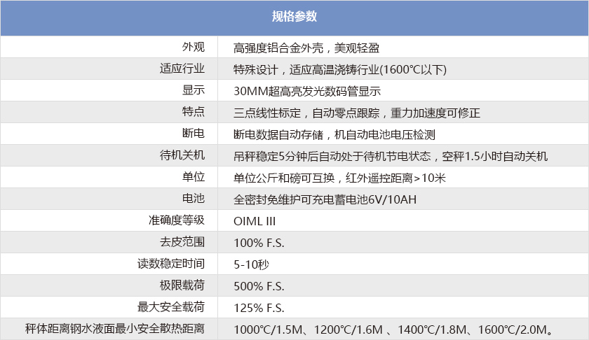 專為冶金、鑄造行業(yè)度身設(shè)計(jì),適用于高溫環(huán)境。它在原有普通秤體的基礎(chǔ)上作了專門的設(shè)計(jì)與改進(jìn)。以保證在高溫環(huán)境下能獲得較好的準(zhǔn)確性。